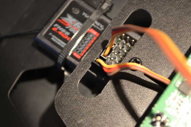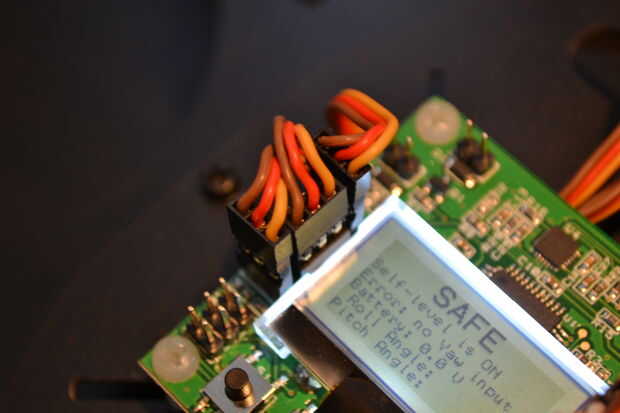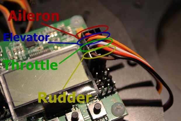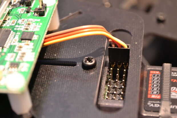 En primer lugar, enchufe uno de servo conduce a través de los tres pernos en el receptor de radio que corresponden a canal uno. Oriente el tapón de modo que el cable marrón en el exterior. Luego, conecte el otro extremo del cable de servo en el enchufe del alerón en el tablero KK2.1, que es la superior. Este enchufe debe orientarse con el cable marrón en el pasador exterior. En mi quadcopter, pegué el cable por debajo de la tarjeta de control de vuelo para evitar que el hilo colgando al aire libre.