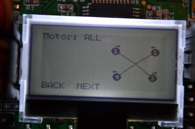 Una vez que tienes los cuatro apoyos Unidos y ha apretado las tuercas hasta que estén muy ajustados, necesitamos verificar que los motores se gira en la dirección correcta. En primer lugar, memorizar las direcciones en los motores se supone que gire (vea la lista de arriba). Luego, oprima el botón back tres veces hasta que el KK2.1 es volver a la pantalla de inicio. Encienda su transmisor y brazo el quadcopter moviendo la palanca izquierda a la posición abajo a la derecha.