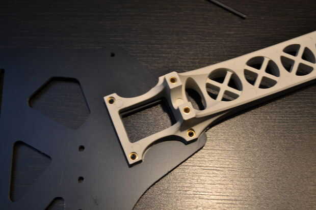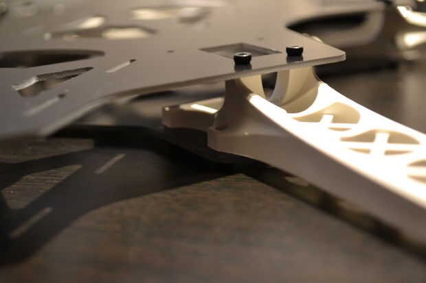 Considerando que existen cuatro orificios en la parte superior de los brazos SK450, sólo hay dos en la parte inferior; Alinee los orificios en la placa inferior de cuerpo con los de los brazos. Luego, aplicar un pequeño punto de bloqueo de rosca a los tornillos como antes y tornillo en los brazos de SK450. Una vez más, los tornillos deben quedar ajustado, pero tenga cuidado de no romper nada al apretar hacia abajo demasiado.
