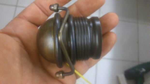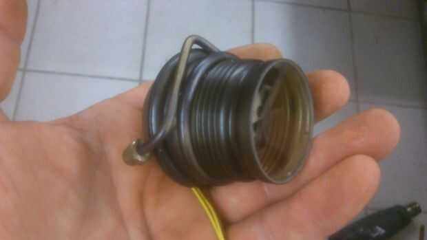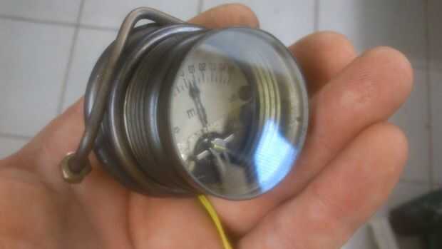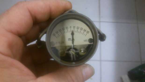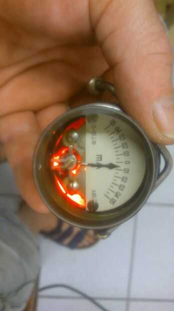 En una de las dos bolas de latón está sentado el instrumento de medida. Cortar la cabeza de la bola en el diámetro del instrumento. La soldadura de la + y - Cable y páselo por el agujero de la bola fuera. Fijar el instrumento con Hotglue un poquito. Entonces soldadura Led la naranja con + y - cable, reducirlo y fijarla con Hotglue bajo el instrumento de medida. Corte un hilo de un zócalo del bulbo lo desea y cerrar la abertura con un windowpane thon. Tenía derecho uno adecuado que realmente cabe en el milímetro adentro;