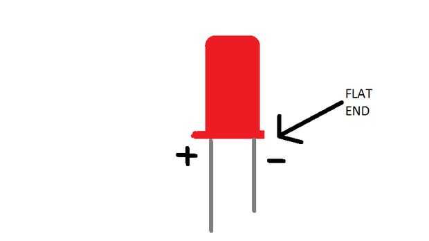 Si tienes problemas para decir si el LED está al revés o no, aquí hay 2 maneras que usted puede decir 1-la plana es sobre el cátodo, o la negativa final. 2 - el cable más largo es el annode, o el extremo positivo. (Ver imagen 2)
