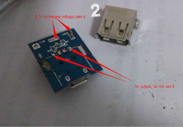 Retire el terminal USB y otras partes innecesarias pero tenga cuidado de mantener el circuito de protección de recarga bien (cuando el voltaje de la batería es superior a 4.2V, parada de carga). Utilice el multímetro para averiguar el derecho de las almohadillas de soldadura.