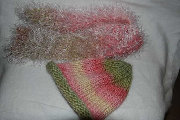 este sombrero de punto porque me encanta jugar diferentes tipos de hilado. Este sombrero utiliza variadas León marca lana. Y para la bufanda abigarrado León marca lana también se combina con la piel de la diversión. Para el sombrero usa el tamaño de la aguja de tejer Unidos13 / 9,0 mm y el tamaño de la bufanda también. El tamaño de sombrero terminado L - 9 1/2 "y el W-6 1/2". La bufanda es 43" de largo y 3" de ancho y la puntada es 1 punto, hilado, hasta el final y luego vuelta siguiente fila es tejer 1, deje caer un hilo hasta el final. Se llama esta puntada puntada de la gota.