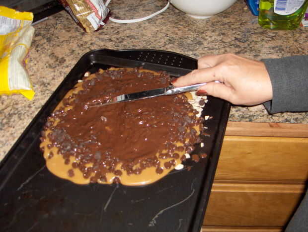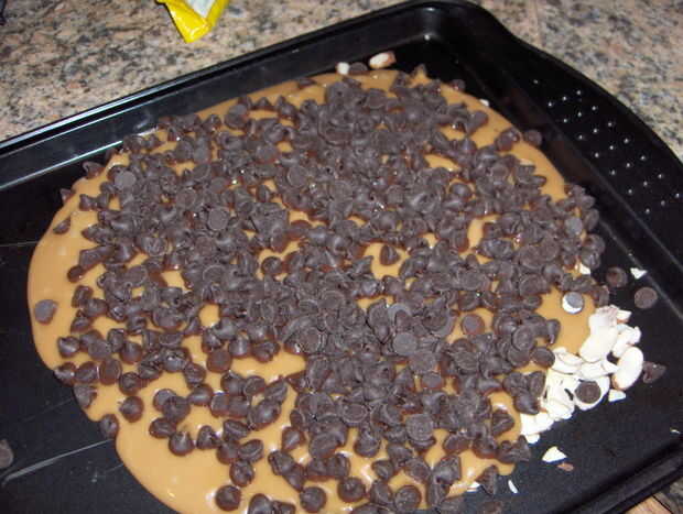 Ahora, espolvorea las chispas de chocolate sobre la mezcla caliente. Dejarlo durante unos 30 segundos.