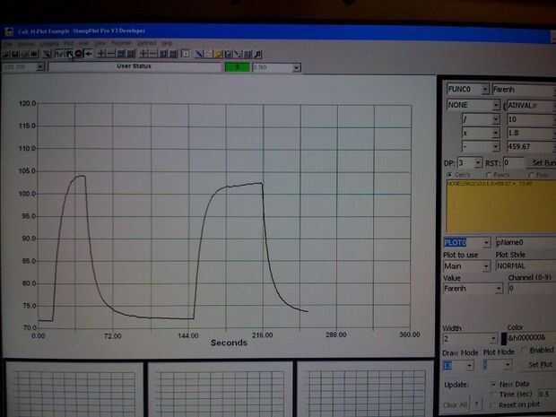 Otra opción es que usted puede utilizar un programa gratuito como StampPlot Pro de SelmaWare para trazar los datos en serie en tiempo real. Usé la opción de gráfico "Calc-n-parcela" de StampPlot Pro porque puedo agregar una función de matemáticas en el programa que funciona en cada elemento de datos recibidos recibido desde el PIC. Los datos del proyecto estan en grados Kelvin y el último dígito es el lugar de la decimal, por lo que se debe dividir por 10 para recuperar el sistema decimal. Puede entonces trabajar con Kevin directamente o convertir a Celsius o Fahrenheit por simples matemáticas.