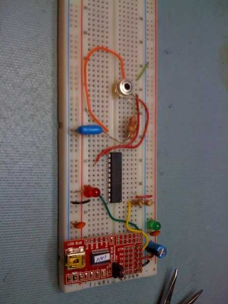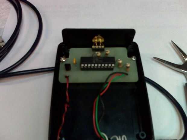 El dispositivo se comunica con el PC en un link USB. Después de la construcción, usted puede modificar fácilmente el dispositivo si desea comunicarse a través de un puerto COMM de la PC. Esto liberará el adaptador USB para usar en otro proyecto. Después de ensamblar todo y hacer la programación y pruebas, me transfiere las piezas a un minibox y había añadido un regulador de 5V que podría correr el proyecto de una batería de 9V.