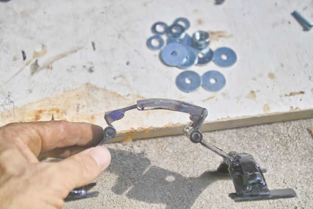 Pero de todos modos básicamente el arco grande es soldado con autógena al lado de la bisagra sin el portaobjetos sobre un ángulo de cuarenta y cinco grados hacia la diapositiva. Luego coloca una media pulgada en cada lado de la y soldados primero los extremos de cada correa ancha y luego una tachuela en el centro luego soldar los bordes de los dos arcos a lo largo, luego para la buena medida ha añadido una tercera en el lado exterior y repite el proceso.
