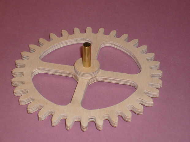 Siguiente diapositiva un ¼" espesor de 1" centro de la madera contrachapada del diámetro en el eje. Asegure estas partes entre sí y el eje con pegamento como se montan.