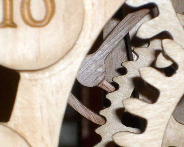 Manualmente del oscilación y mantener el péndulo hacia la izquierda. El trinquete motriz debe girar la rueda de trinquete hacia la derecha. Mira la interfaz de rueda de trinquete y gancho de sujeción. El gancho de sujeción debe borrar un diente en la rueda de trinquete y de la tierra sobre a mitad de camino sobre el diente siguiente con el péndulo hizo pivotar a la izquierda. Ajustar el ángulo de la condena de cierre en su brazo hasta que éste es el caso.