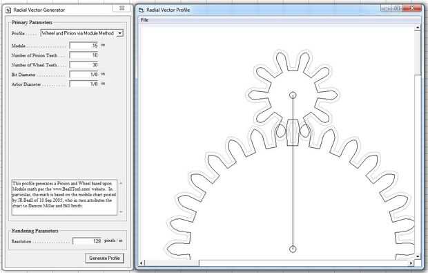 (Uno de los insumos del programa es el "módulo", que es la distancia de eje * 2 / (no. de los dientes de la rueda + no. de dientes del piñón). Deje que la hoja de cálculo calcular el módulo necesario al espacio de los engranajes en ejes exactamente 3" apart.)