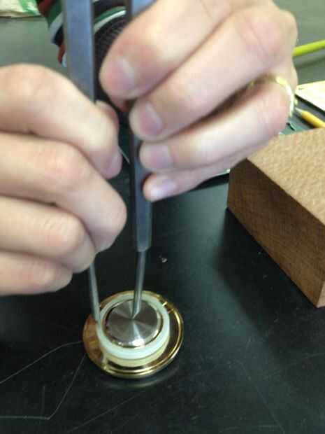 comencé usando la brújula para medir el radio de la parte trasera del mecanismo del reloj.  El reloj que compré tenía una Junta de silicona alrededor de la parte posterior.  Quería asegurarse de que no cabría libremente (en un bloque de madera), por lo que no mide todo el camino hasta el borde exterior de la Junta de silicona.  Bloqueado la brújula en lugar que pude utilizar para dibujar el círculo en el bloque de madera.