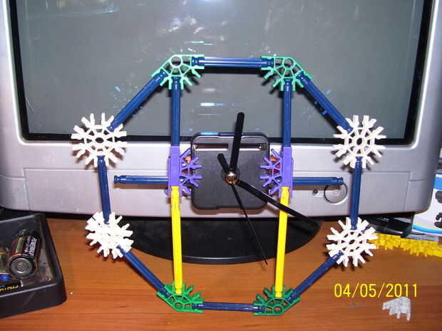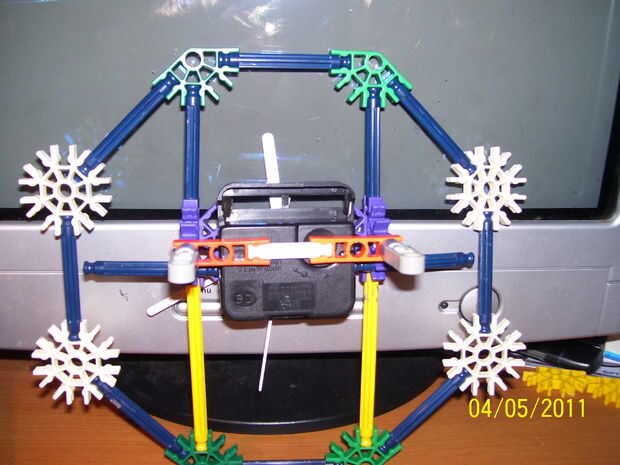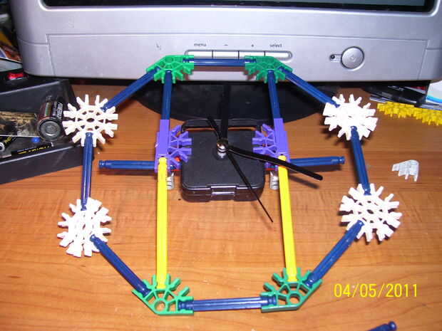 es un reloj de KVG que utiliza 4 de los siguientes: verde conectores, conectores de copo de nieve, conectores de ángulo recto. 2 de los siguientes: trozo conectores, conectores rectos. 3 barras blancas, 2 barras amarillas, 12 barras azul, motor 1 reloj y 1 batería. es un reloj bastante decente pero lo unico es que no tiene los números en él. hacia abajo a continuación se muestran las imágenes. Espero que chicos como él!