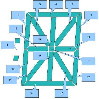 Vamos a tener una mirada más cercana en el VFD y su conductor. Para un dispositivo externo VFD es accesible a través de una interfaz como la RAM estática. La pantalla tiene 7 dígitos (símbolos) de 16 segmentos. Cada símbolo se define por dos bytes (16 bits), por lo que en total 14 bytes se utilizan. Un símbolo es codificado por una combinación de bits, ajuste un poco a ' 1 hace un segmento se ilumine. Byte más significativo es lo primero, el bit más significativo también es lo primero. Así, con el fin de mostrar el primer símbolo en la pantalla como ' 1 el primer byte de RAM debe ajustarse al valor