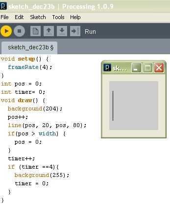 Aquí es algo muy simple de código que hace esto. Esto se basa en un ejemplo que fue incluido en la descarga de procesamiento. El código de orgingal funcionó una línea a través de la pantalla, moviendo una posición para cada bucle a través del programa. He añadido un parámetro llamado 'timer' coundt hasta 4, cambia el fondo a blanco, luego se restablece a 0 y empieza a contar otra vez.