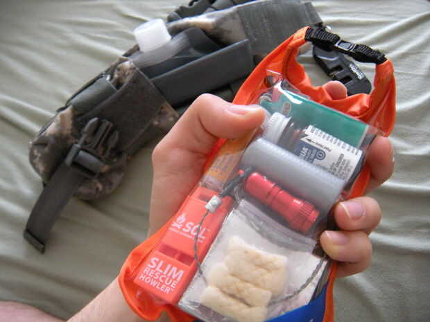En una situación de supervivencia algunos de los elementos de este kit están diseñados para ser usados. El Ka Bar es uno de ellos. Incluidos en este kit es un cinturón táctico militar para tomar el peso de la vaina. He atado paracord alrededor de la parte posterior de la vaina para que este kit se puede usar horizontal a lo largo de la correa así. Dentro de la envoltura del bolsillo es un kit de supervivencia de SOL muy modificado que mantiene el contenido seco. Aunque este bolsillo vaina fue modificado para requisitos particulares por mí, Maxpedition vende así.