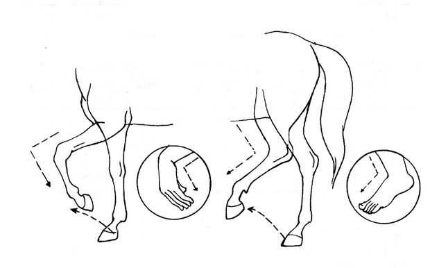 Cuando levanta la pierna, la articulación del muslo se levanta primero y luego dobla el empalme del becerro para la elevación de la pierna mejor. Entonces el caballo marcha hacia adelante.