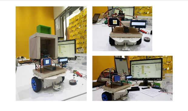 Combinado con el bosquejo del diseño, hemos definido el diseño del aspecto y la disposición de espacio interior. El robot se divide en cuatro capas. La parte inferior (la cuarta capa) es un chasis de coche, equipado con dos ruedas y dos dispositivos de ruedas que permiten al robot a moverse de la barra de tabla. La tercera capa es la zona de control de hosting un tablero de control del robot, un panel de control del sensor y un tablero de control del motor. La segunda capa es un área de almacenamiento, en el que pueden colocar alimentos y bebidas. La parte superior (la primera capa) es la cabeza del robot, donde diseñamos una pantalla de LCD para dar las emociones de la vida como robot e interacción. Cuando el robot está en funcionamiento, una cara sonriente aparece en la pantalla de LED. Cuando llegue a la ubicación especificada, la carita de LCD se transforma en un código QR, a la espera de pago del cliente. Además, la banda de LED parpadeante alrededor del robot tiene diverso color y ritmo opción para que el Doggie4 puede interactuar sin problemas con sus usuarios.
