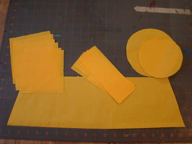 Extienda el material y corte: 6 – 3 "x 3" plazas (cabeza), 1-6" círculo. 1 – 5" círculo, 1 – rombo (16" de largo en la parte superior y 19" de largo en la parte inferior, corte de líneas rectas de la parte superior a la parte inferior en cada extremo) y 4-2½" x 6½" rectángulos (brazos y piernas).