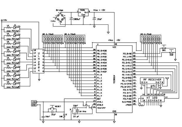 La señal transmitida por el emisor llega a la unidad receptora donde los datos es recogidos por el módulo de RF y proporcionan el decodificador ICHT12D. El decodificador que IC proporcionará datos de 4 bits para el micro controlador y la unidad de micro controlador reconocerán la señal y proporcionarán los datos pertinentes a esa particular IC (ULN2804), este IC conducirá respetados motores conectados a la misma para uso particular.