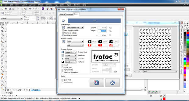 Ahora, toma tus gráficos y enviar al láser. Con el software de JobControl® de Trotec, simplemente decimos lo que está usando una rotatoria y entrar en el diámetro y la altura. Automáticamente calcula la circunferencia y gira la imagen. Ahora Dile qué materiales utiliza y enviarlo sobre el láser.