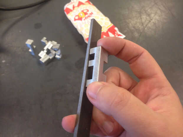 Sólo mantenga la pieza contra un fichero (¡ limpio!) fino como en la foto. Ignorar mi pinky, no tengo tres manos para tomar la foto. Usando super ligera presión, cualquier superficie plana sin rebabas se patina solo en el archivo sin conseguir corte. Las rebabas sobresaldrán en los dientes de archivo y obten despumadas. Sólo mantener la presión realmente ligera y constante movimiento y a sentir la parte liberar e iniciar deslizamiento cuando las rebabas desaparecen. Las rebabas se también haz sacadas mejor si usted orientar la pieza para que bordes esquirlas particulares se enfrentan a la dirección del corte (hacia el mango). Usted puede hacer esto en todas las superficies de estos rompecabezas con un poco de práctica.