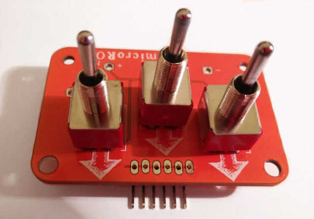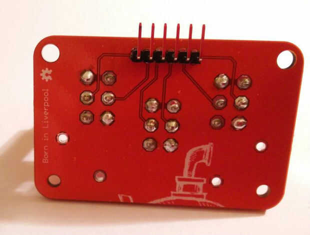 Coloque el lado más corto de los pernos por los orificios de la parte inferior de la PCB para que la parte más larga está por debajo de la PCB. Puede utilizar la plastilina de nuevo el PCB y luego soldar las seis clavijas en su lugar.