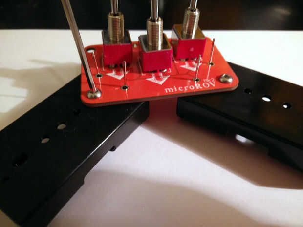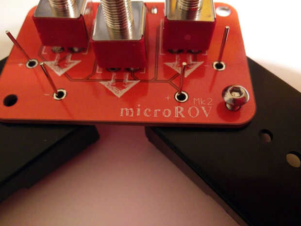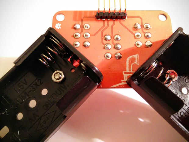 Coloque los conectores de los titulares de la batería a través de los agujeros en la PCB. Debemos garantizar a los titulares antes de soldar, así que coloque el perno de 8mm M3 a través del agujero en cada esquina y a través del orificio en el soporte de la batería.