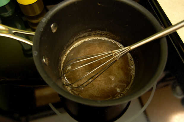 Su 1/2 taza de turbinado de la mezcla azúcar con una 1/2 taza de agua en una cacerola pequeña. Utilicé uno de tamaño mediano, y como se puede ver, era un poco excesivo. Revolver frecuentemente con una cuchara o batidor. Usted notará el oscurecimiento de color y la textura cambian. Esto tomará varios minutos asi que tengan paciencia. Cuando se pone muy espeso, tire de ella fuera de la estufa y tienen un gusto. ¿Buena y dulce? Gran. Si tiene un sabor quemado, se quema, así que empezar de nuevo.
