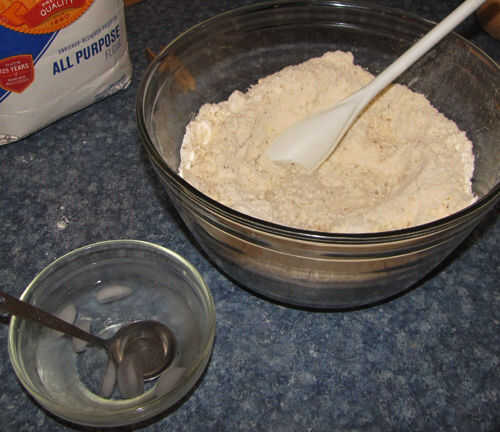 Ahora, transferir los ingredientes secos en un tazón grande. Extensión 6 cucharas de mesa de agua sobre la mezcla seca y comenzar a trabajar juntos con una cuchara hasta que la masa se reúne en una bola (puede que necesite usar también las manos).