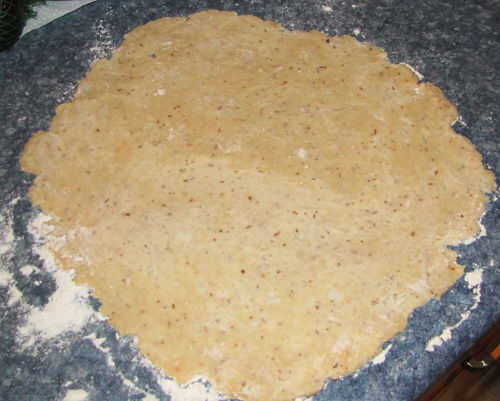 Una vez la masa ha tenido tiempo de firme para arriba. Retire del refrigerador y déjela ablandar durante 5-10 minutos. Luego sobre una superficie ligeramente enharinada, rodar la masa uniformemente en dos círculos de 12 a 14 pulgadas. Tenga cuidado de mantener incluso el grueso.