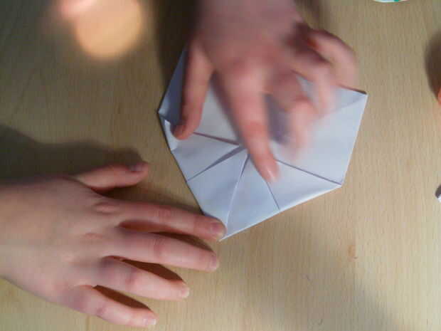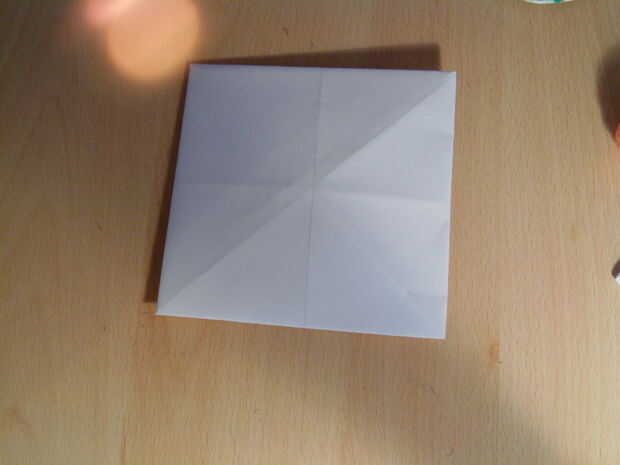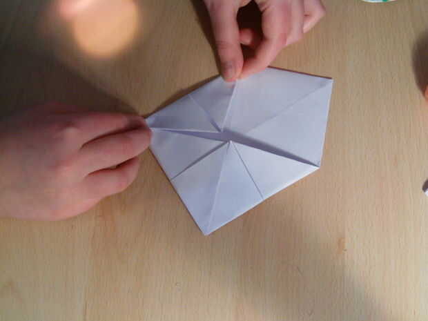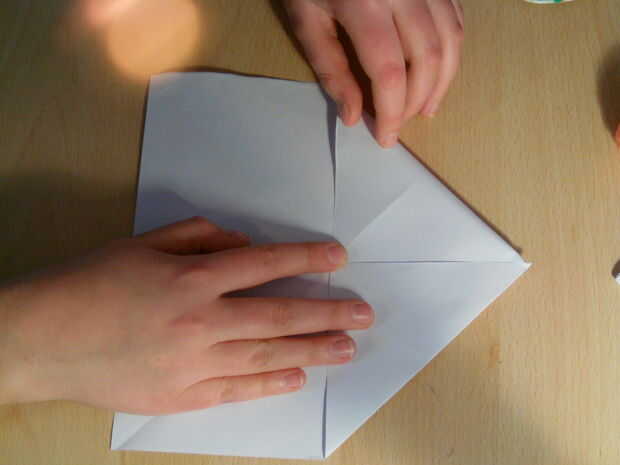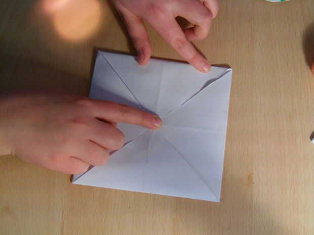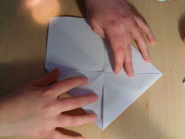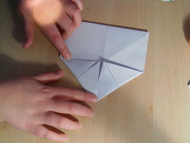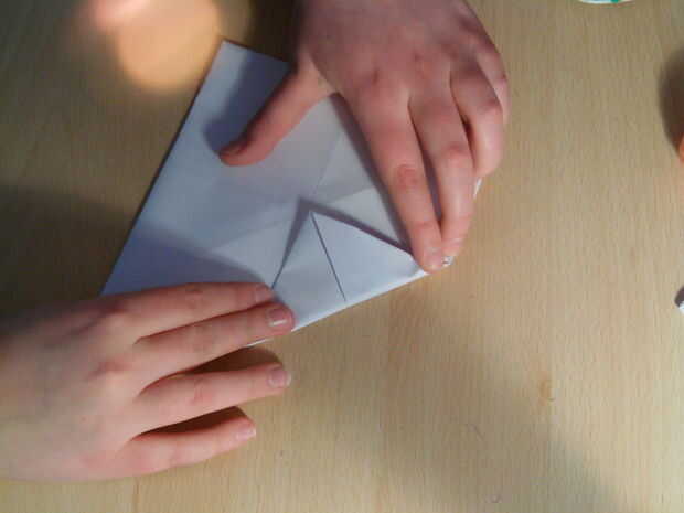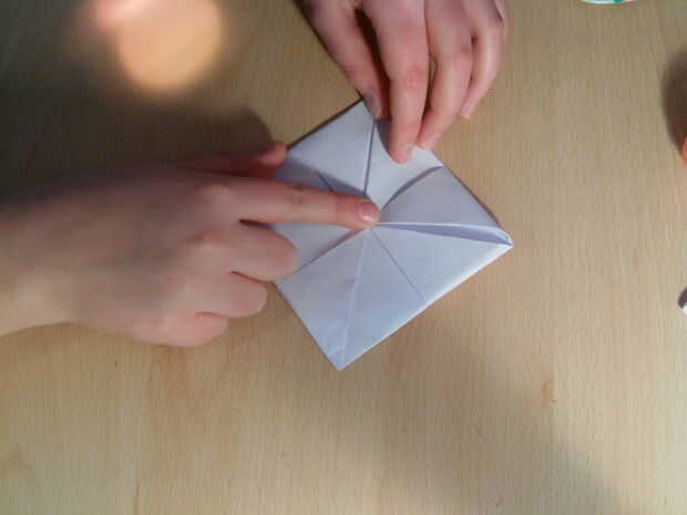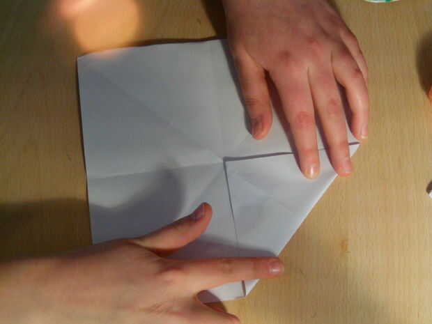 Ahora doblar las esquinas exteriores hacia el centro, a partir de la esquina inferior derecha. Pliegue el borde así que crujiente! Trate de ser ordenado como este es un paso importante. Si no puede ver el centro claramente Repita el paso 3 hasta que pueda! El tratar este paso otra vez. Doble las esquinas hacia el centro. Ahora Dale la vuelta y repetir otra vez, doblando las esquinas en el centro!