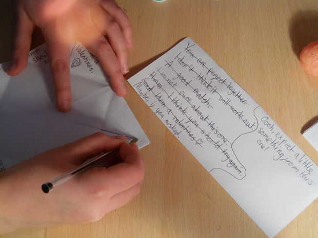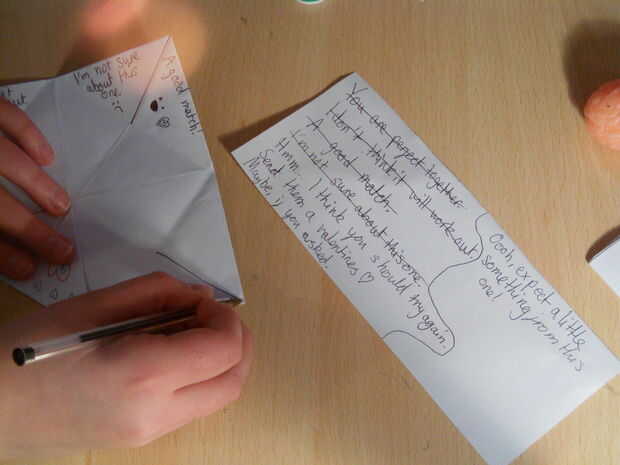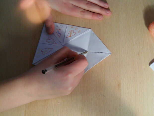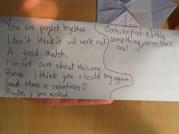 Ahora usted necesita trabajar en lo que va a decir cada aleta. Este adivino es decirle si alguien + se sirven juntos o no. Hacerlos en un pedazo de papel y tratar de crear 3 buenas respuestas, 3 respuestas malas y respuestas bien 2. Abrir una aleta y trace una línea por el centro para hacer dos 'cajas' escriba ahora cada uno hacia fuera por separado en cada mitad de una aleta. Usted puede coordinarles con los colores (por ejemplo color de rosa = buena respuesta) pero no lo hice. También podría agregar dibujitos para ilustrar el significado.
