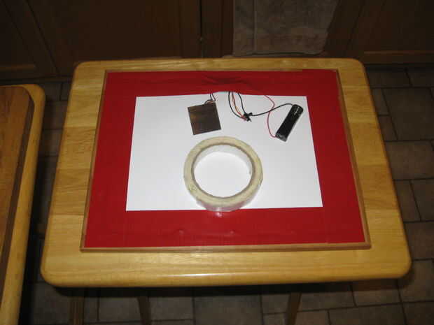 Con la cinta adhesiva de dos Coloque el batería titular de células solares y en la parte trasera del marco y tapa los cables con cinta aislante más.