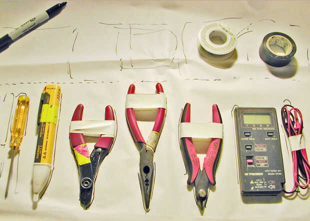 Esto es tan simple como poner todas las herramientas que desee en un pedazo de papel de estraza, con espacio suficiente entre ellos para que te ruede. Date algunos bolsillos de repuesto, sin embargo. Siempre terminarás agregando algo más tarde.