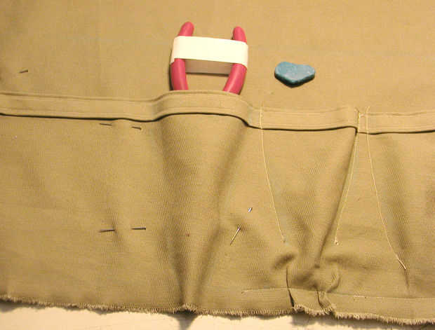 A partir de un borde, cose en la cáscara, y luego ir a una herramienta o en el bolsillo a la vez; la celebración de la tela hasta forma el espacio para el bolsillo, entonces la costura hacia abajo. La clave aquí es todo el que se da es en su capa interna; Esto significa que la cáscara es suave (más o menos).
