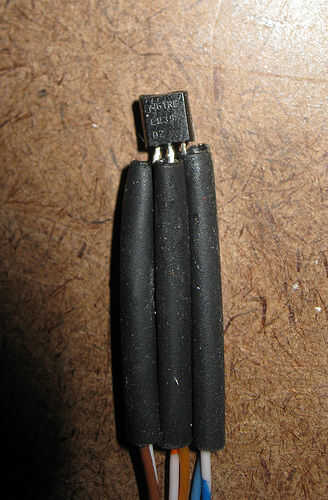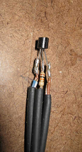 Antes de soldar, he añadido pequeños tramos de tubería de calor retráctil a los conductores y dos más grandes sobre cat-5. Luego, soldar el LM35 al cable cat-5 y agrega un resistor de 10K a Vout (centro) para estabilizar la señal por la longitud del cable.