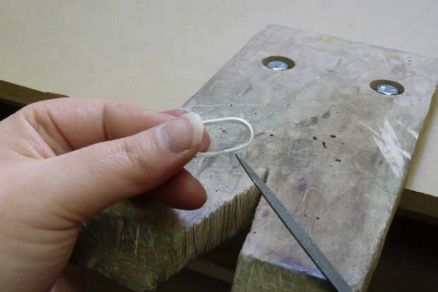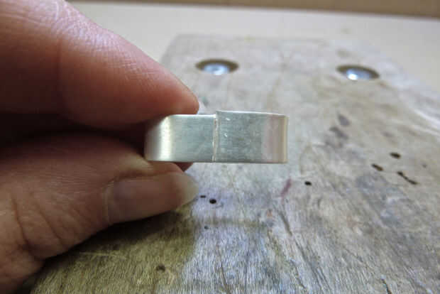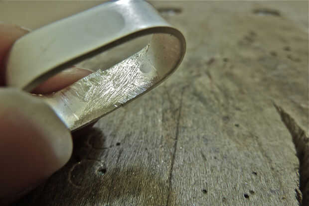 Lo primero que debe hacer después de soldar es asegurarse de que usted ha hecho soldado. La soldadura debe haber fluido alrededor y a través de la costura (imagen 39) el siguiente gran paso es modelar el anillo en el mandril de un anillo de acero con un martillo blando. El acero es mucho más difícil que plata así que recuerde detener y preguntar "Qué puedo dañar?". Habrá soldadura extra sobre la costura. Si la soldadura adicional en el interior del anillo no se quita antes de formar, la soldadura adicional se clavará en la plata por el mandril anillo de acero y será muy difícil de quitar después, sin quitar también una capa de plata. Usando un quitar archivo de aguja plana la soldadura adicional antes de dar forma (imagen 40). Tenga cuidado de no adelgazar los bordes del anillo mientras que quita la soldadura extra, ir lento y a menudo (imagen 41). Imagen 42 ilustra la presentación completa.