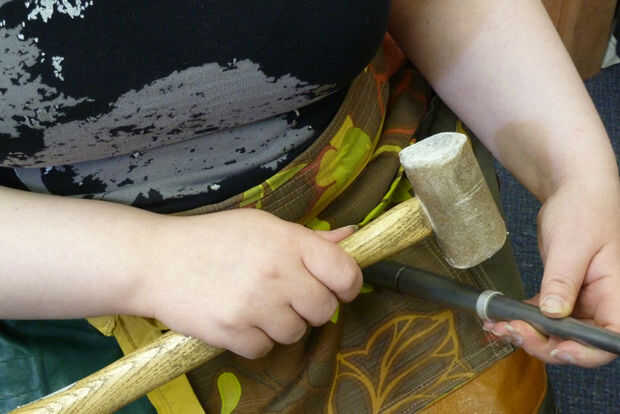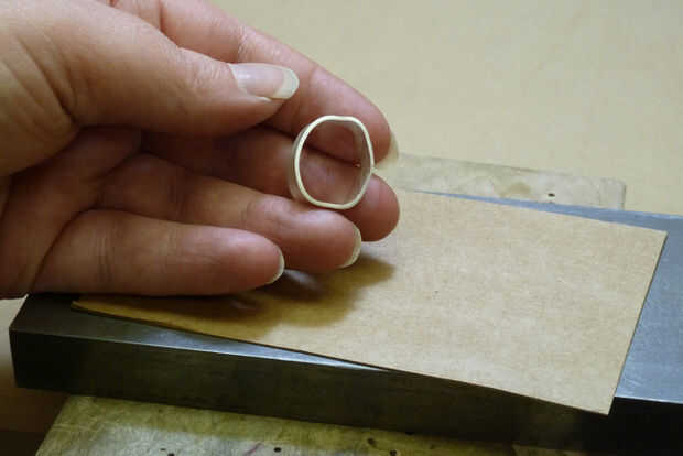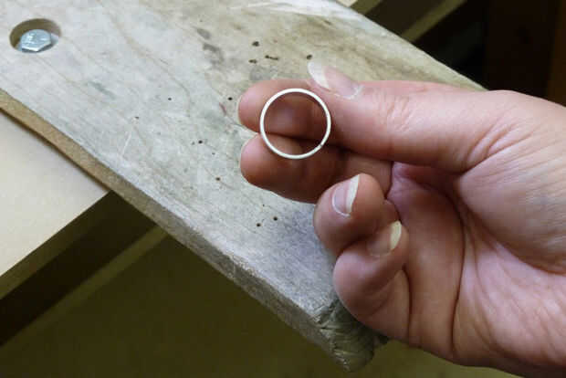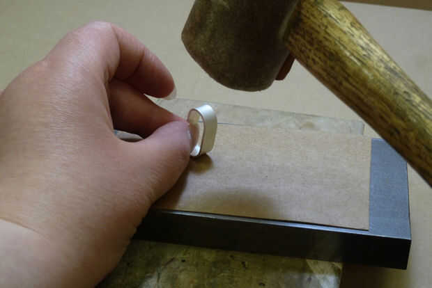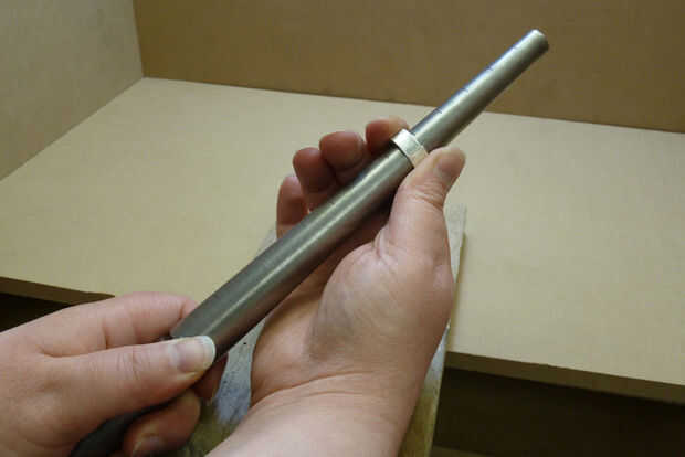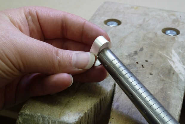 Tire o apriete del anillo como lejos abajo el mandril anillo que puede (imagen 46). Al estar sentado, sostenga el mandril anillo en la parte superior y apoyo de la palanca contra su cadera (imagen 47). Martillo duro con un martillo blando. El mandril es cónico y se forma el anillo así, para evitar que este Retire el anillo y su posición en el mandril anillo de tirón cada vez y un rato. Cuando terminado el anillo no debe tener ningún "bamboleos" (imagen 48), pero debe ser suave y redondo (imagen 49).