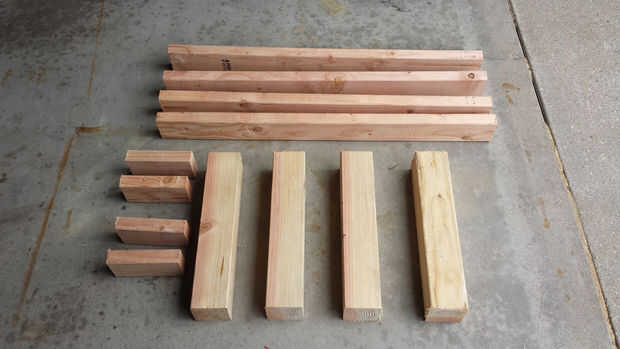 Usé una sierra de ingletes para cortar las piezas para estas cantidades y dimensiones: