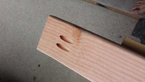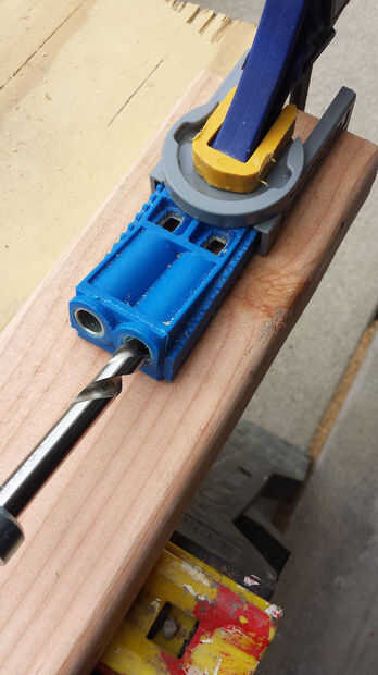 Elegí bolsillo agujeros por lo que no veo los tornillos en el exterior que presta un aspecto más moderno y elegante a la banca. Taladré agujeros de bolsada en el 2 x 4 x 39 y de 2 x 4 x 7 los extremos como muestra la imagen. El método más fácil era utilizar una plantilla de agujero de bolsillo. Una tienda de comprar uno es una buena inversión pero no es difícil crear tu propia plantilla a partir de un pedazo de madera.