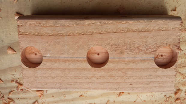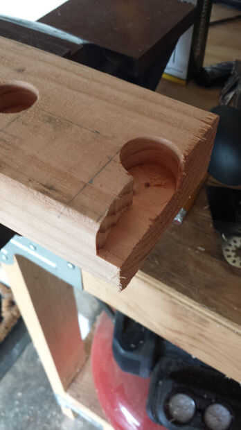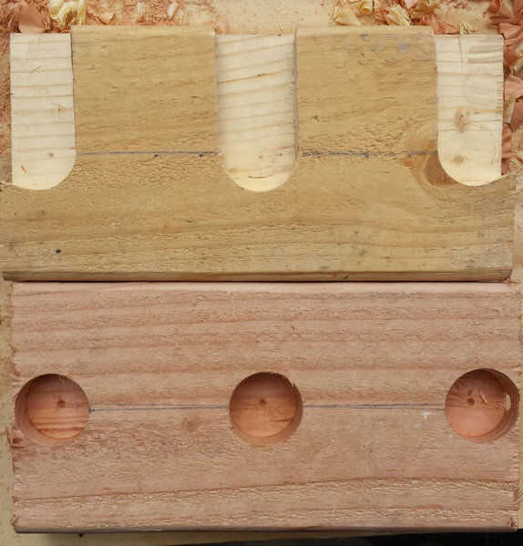 Para crear sockets para los estantes de tubo para utilizar una pieza Forstner para cortar tres cavidades circulares de dos de 2 x 4 x 7. Luego usé un router para quitar la madera de un lado de los agujeros circulares en uno de 2 x 4 x 7 para que las tuberías podrían deslizar hacia abajo y en posición, haciéndolos extraíble es también una opción para sólo dejar las cavidades circulares como es y no de un lado la ruta pero una vez que el Banco terminó las tuberías no sería extraíble sin desarmar el Banco. Si decir que quería poner el banco exterior y los tubos es necesario volver a pintar después de una temporada o dos, esto sería una gran molestia.