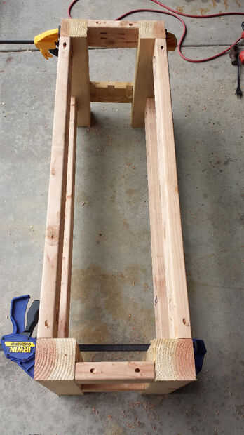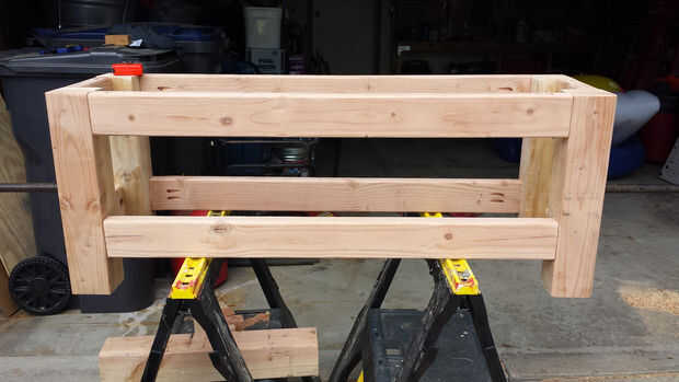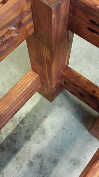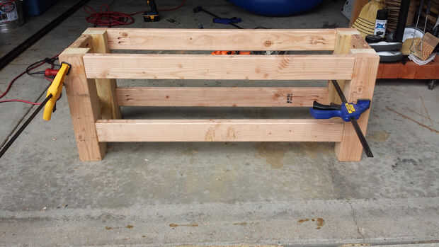 La estructura del Banco es bastante simple. Os adjunto las piernas a la 2 x 4 x 39, aplicando pegamento y tornillos en los agujeros de bolsada. Usé la misma técnica para el 2 x 4 x 7, les sujeción también para la buena medida mientras el pegamento seca. Luego lijar el Banco con una lijadora orbital y había manchado con aceite de madera de Cabot australiano que es un tiempo todos (y también no necesita cualquier capas de sellador después). El tinte se aplica con un pincel y el exceso se limpia, dejando un acabado agradable.