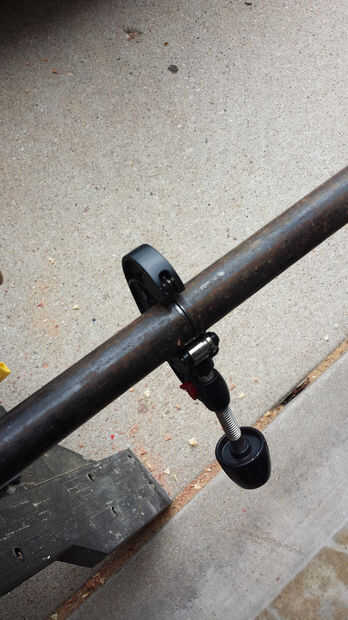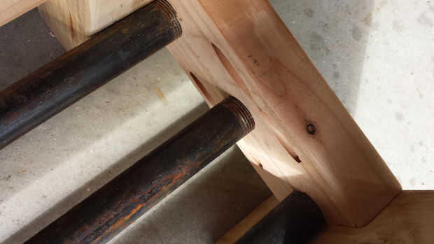 Para el estante de pipa utilicé tubo negro de 3/4 pulgada (corte a 44,5") que tiene un diámetro exterior de cerca de 1 pulgada. Esto encajará muy bien en los agujeros de 1 pulgada cortados con la pieza Forstner. Hay varias formas de cortar el tubo, pero me un cortatubos simple que aprieta alrededor de la tubería, corte eventualmente a través de él. Tubo negro generalmente ha los extremos roscados al comprar, que me aseguré de mantener como las pipas se atornillarán en a las tomas circulares.