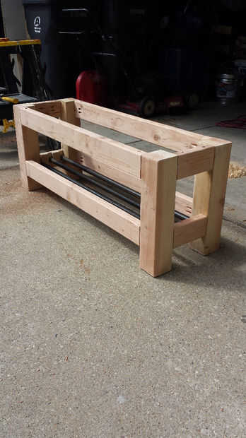 Este banco sencillo, moderno y robusto cedro, es fácil de construir y podría ser utilizado al aire libre o por qué no en el interior en un hall de entrada o algo así. Cuenta con una raya blanca por el medio, y en lugar de ocultar el hardware, los per