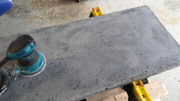 Después de tres días he quitado la losa de hormigón de la forma y había lijada con lija de grano 180. Decidí no llene los agujeros bug restante con cemento Portland (como en mi último Instructable) como el hormigón inacabado complementa las líneas limpias de la base de madera. Sin embargo froto unos capas de sellador de concreto en la losa para hacerla resistente al agua y oscurecer el color.