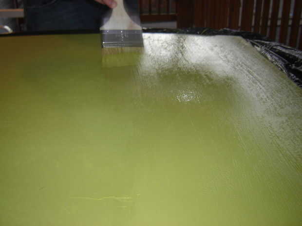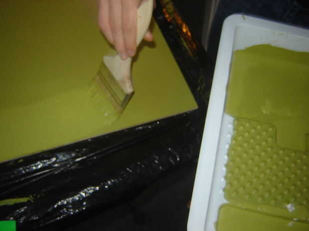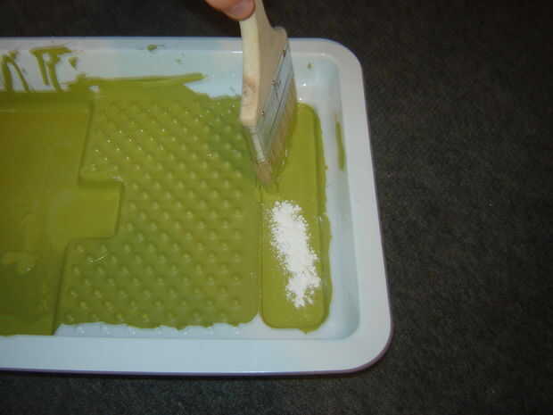 Rodillo o a brocha la pintura grouty sobre el tablero. Trate de distribuir uniformemente la lechada sobre el tablero moviendo la pintura hasta satisfecho.