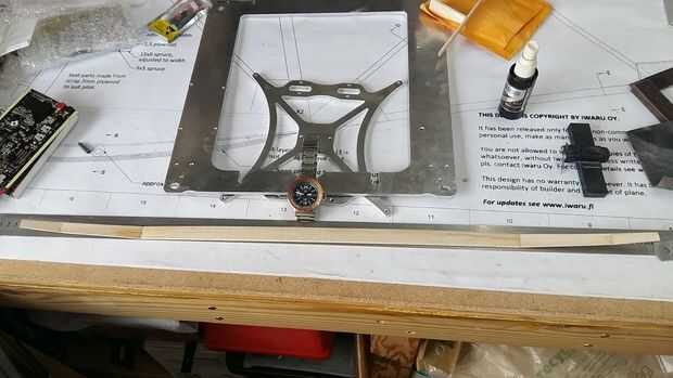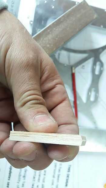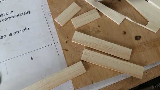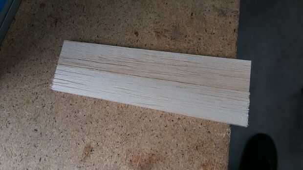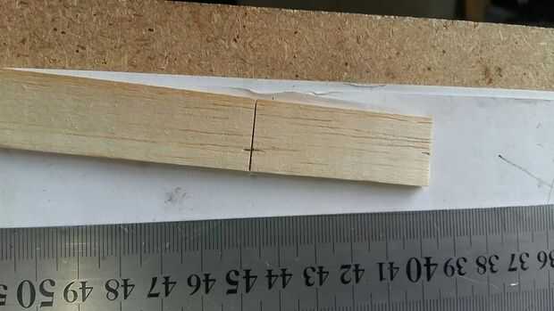 Volviendo a la tira larga de madera. Para poliédrico alas le entonces necesita dos piezas idénticas de corte, para cada sección una vez más que cortar una longitud al azar. Decidí que dos piezas de 100mm era buena. Entonces corté otro dos piezas, esta vez más corta en 50mm, estas donde cortar en un ángulo para darle un aspecto trasero de barrido. Si tienes que ver las imágenes puedes ver que la forma en el borde de ataque de alas barre detrás. Doblé el borde de ataque del ala para la diversión de ella, tal vez más adelante se curva de la parte superior de la superficie de sustentación, se debe mejorar el deslizamiento.