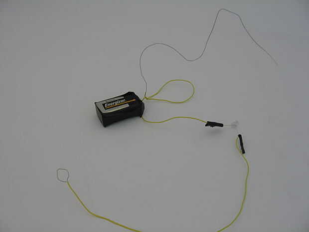 Toma el LED (o timbre) y coloque el cable más pequeño a un lado y el cable 14" al otro lado. Luego tomar el alambre pequeño y conecte el otro extremo a un poste de la batería. Luego tomar el alambre más largo y conecte el extremo para el otro polo de la batería. Ver la imagen para ver cómo acoplar. Todas las conexiones deben hacerse con cinta aislante.