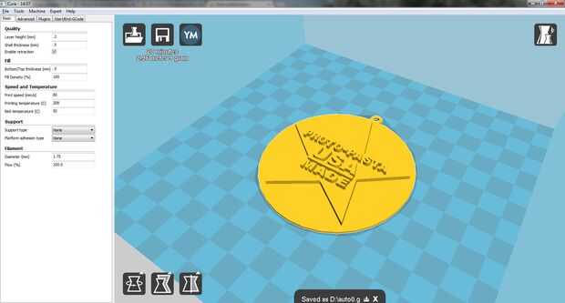 Digital, tendrá que abrir su software de preparación de máquina, como Cura. Cura es un software común para generar código de g para nuestro Metal simple Printrbot y otras impresoras 3D. Puede ver la configuración de la máquina solicitadas en el lado izquierdo. Utilizamos una resolución moderada y son capaces de construir un adorno de 3 color en sólo 20 minutos. Después de cargar su parte en la plataforma, debe guardar el código g para enviar a la impresora.