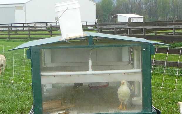 Con cada abrevadero sosteniendo sobre un cuarto de galón de agua, tenían que ser recargado un par de veces al día, especialmente después de que los polluelos tiene más grandes. Usted podría considerar usando un recipiente mucho más grande (digamos un tamaño galón) pero probablemente funcionará en problemas de logística de manera de apoyar algo tan grande y pesado. Puede crear una plataforma que sobresale de la criadora para apoyar pero, si esta criadora es sólo va a utilizar para las primeras seis semanas de la vida de los polluelos, no puede ser vale la pena.